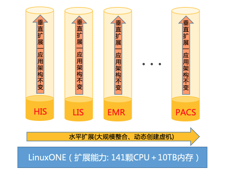 随着信息化的发展,软件使用者数量已趋于饱和,不会像互联网企业那样“爆发式”增长。因此通过LinuxONE服务器性能垂直扩展(Scale up)完全可以满足医院的需求。